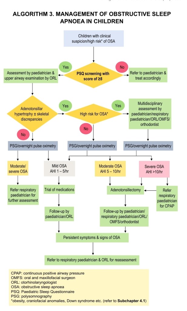 This year, Malaysian Health Ministry produce a CPG for obstructive sleep apnea management for adults and children. I want to share the algorithm for management of paediatric OSA below: