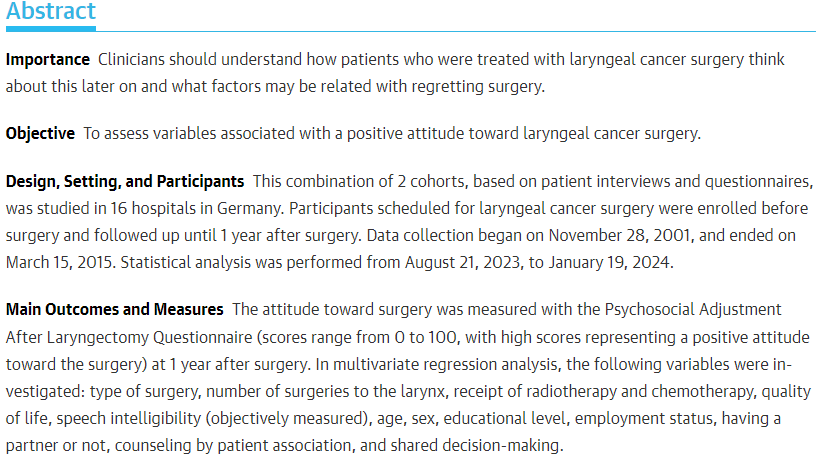 I am delighted to present an intriguing paper examining patients’ reflections on their decision-making process regarding major surgery. This study focuses on cases of laryngeal cancer necessitating surgical intervention such as total or partial laryngectomy. Understanding the impact of our decisions and actions before surgery is crucial as they significantly influence both clinical and emotional outcomes. The key points highlighted include: