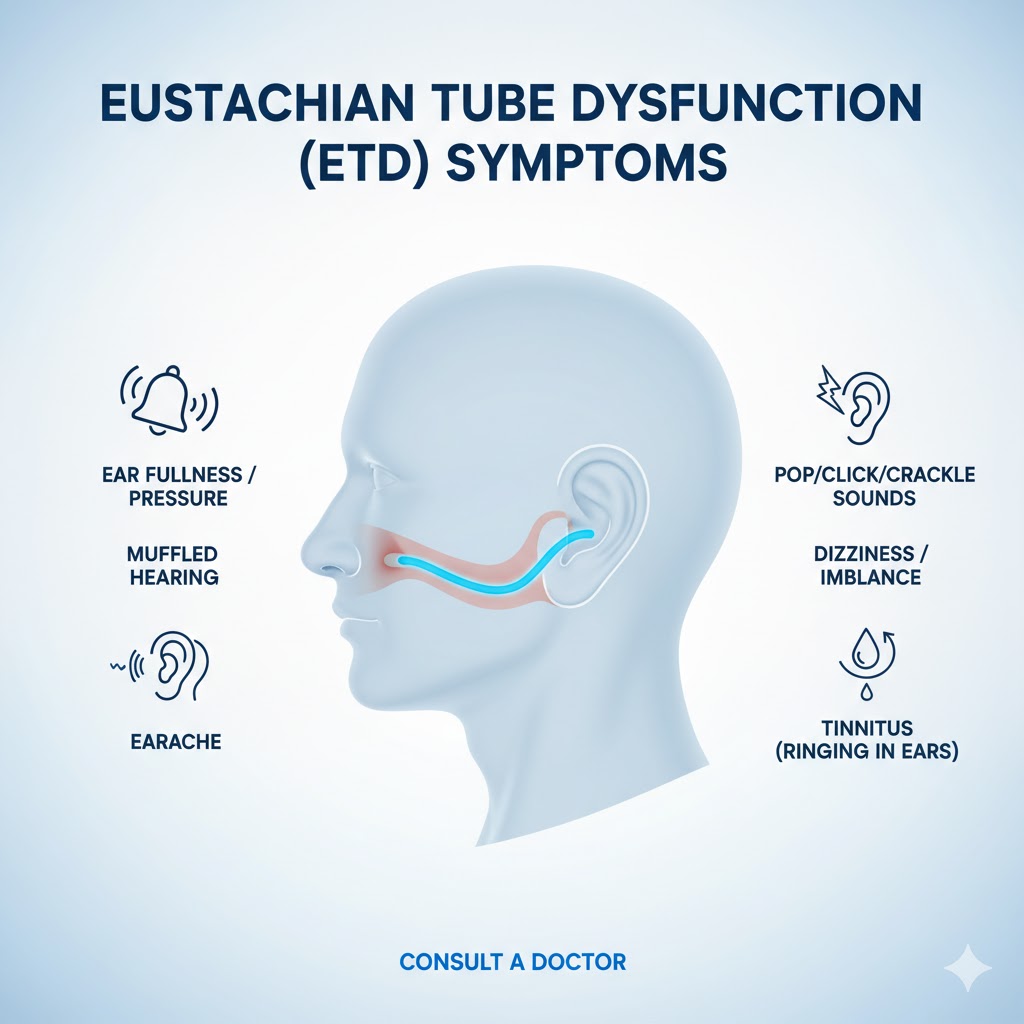 Gejala ETD akan berkaitan dengan ketidakseimbangan tekanan udara di telinga: