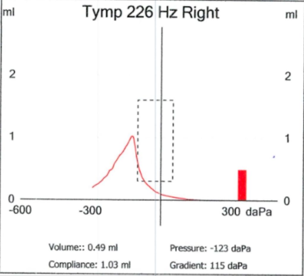 2) Ujian Tympanometry: Untuk mengukur sebaik mana telinga tengah berfungsi dengan perubahan tekanan udara. Keputusan Jenis C akan memberi gambaran bahawa tekanan di belakang gegendang adalah negatif, yang biasanya terjadi dalam ETD.