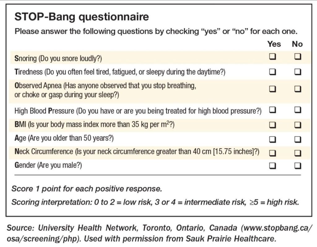 Jika doktor di KK mengesan jemaah haji ada penyakit obesiti kelas 2 dan berdengkur, doktor akan menggunakan STOPBANG Questionnaire, satu set soalan sebagai saringan (screening), yang mana pesakit di nilai dan diberikan markah. Questionnaire ini akan menilai risiko samada jemaah haji ada OSA atau tak.