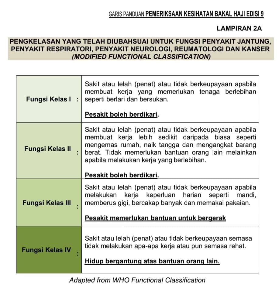 Jika kita lihat Fungsi kelas 3 -> pesakit memerlukan bantuan untuk bergerak! Untuk pengetahuan semua, kebanyakan pesakit OSA boleh bergerak – sepatutnya mereka tidak termasuk dalam kategori 3&4 yang boleh gagalkan kelulusan pergi haji.