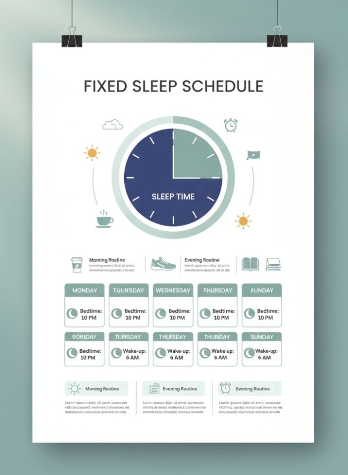 - Set a Fixed Schedule: Go to bed and wake up at the exact same time every day, including weekends. This is the single most important action to regulate your circadian rhythm (your internal clock).
