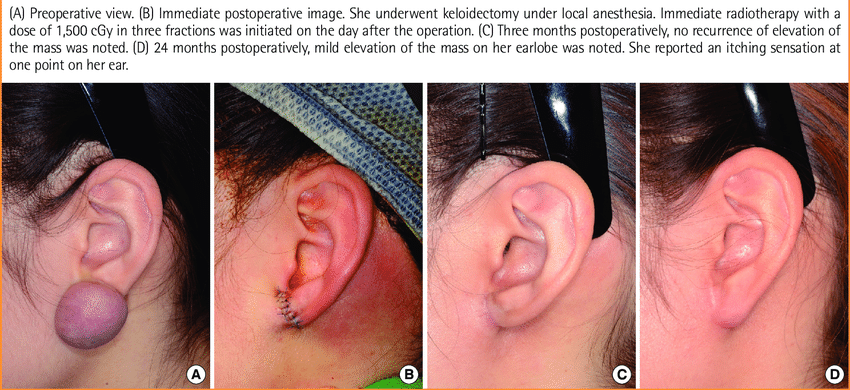 * Pressure Therapy: This is crucial for ear keloids, particularly after excision. Custom pressure ear molds or pressure earrings must be worn for 12 to 24 hours a day for several months to put mechanical tension on the area, which significantly reduces recurrence rates (studies show non-recurrence rates as high as 70.5% to 95%).