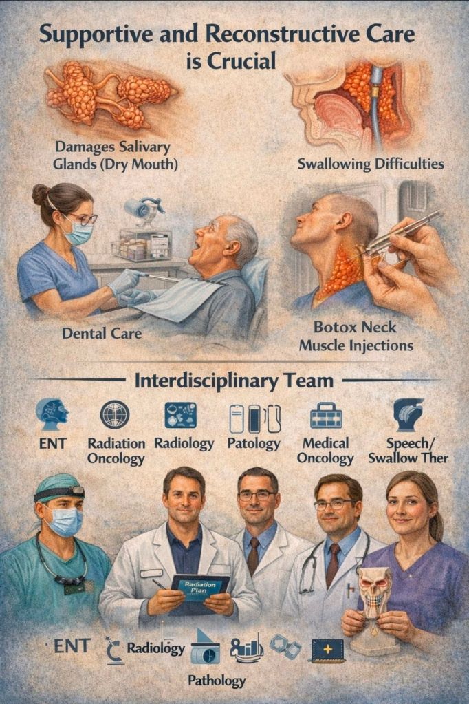 Finally, supportive and reconstructive care is crucial. Radiation often damages salivary glands (causing dry mouth) and sometimes swallowing muscles. Patients may need dental care, swallowing rehab, or injections of Botox to reduce neck muscle tightness. An interdisciplinary team – ENT, radiation, medical oncology, radiology, pathology, plus speech/swallow therapists – is essential. As one expert put it, treating NPC is a team effort. We’re all in the bunker together, coordinating rounds of chemo and radiation to win this fight.