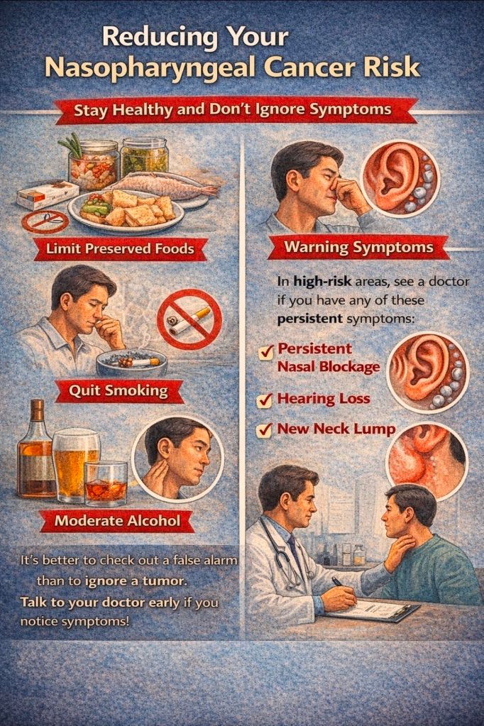 For individuals, reducing risk factors makes sense too. Limiting intake of heavily preserved foods, quitting smoking, and moderating alcohol are all reasonable preventive measures (even though NPC isn’t as straightforwardly tied to these as some other cancers are). Good general health and regular check-ups help too. And importantly: don’t ignore warning signs. In high-risk areas, anyone with a persistent one-sided nasal blockage, hearing loss, or a new neck mass should see a doctor and mention NPC. It’s better to evaluate a false alarm than to let a sneaky tumor grow.