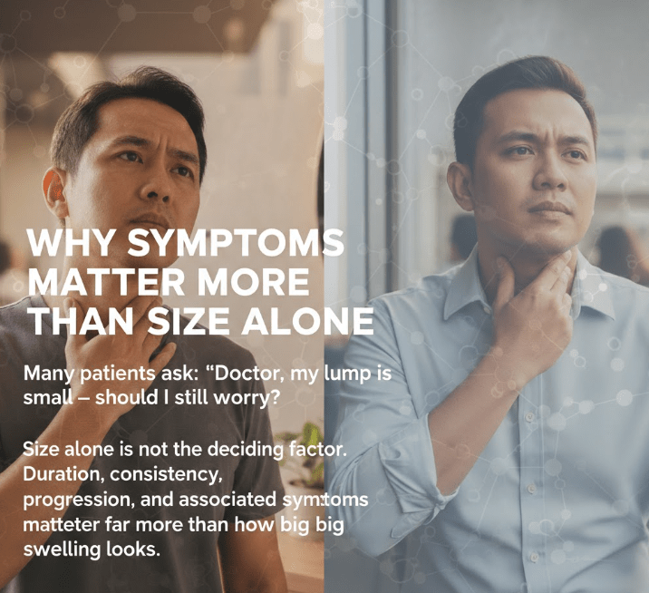 Neck swelling can look and feel very different from one person to another. Some patients describe a visible lump, while others notice a sense of fullness, tightness, or pressure in the neck. In many cases, the swelling is discovered accidentally — while shaving, applying makeup, or adjusting a shirt collar.