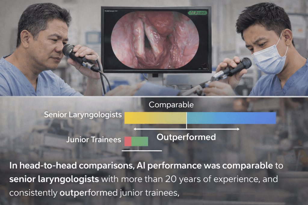 In head-to-head comparisons, AI performance was comparable to senior laryngologists with more than 20 years of experience, and consistently outperformed junior trainees.