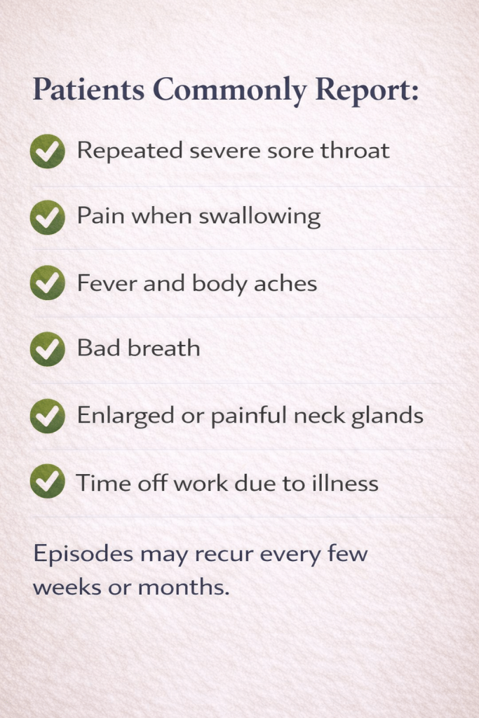 Recurrent tonsillitis is not simply “bad luck.” From an ENT perspective, repeated infection may indicate chronically diseased tonsils. Careful assessment helps identify patients who benefit from surgery and avoids unnecessary antibiotic overuse.