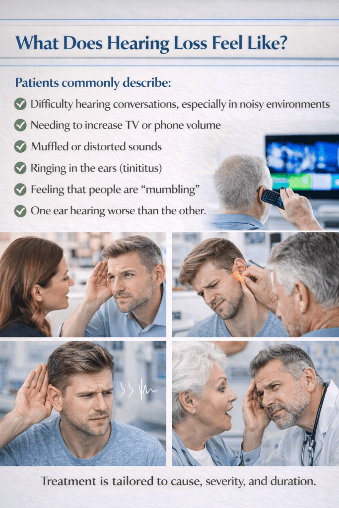 Hearing loss can develop suddenly or gradually, affecting one or both ears. Many adults ignore early hearing problems, assuming they are temporary or age-related. However, untreated hearing loss can significantly impact communication, work performance, safety, and quality of life.